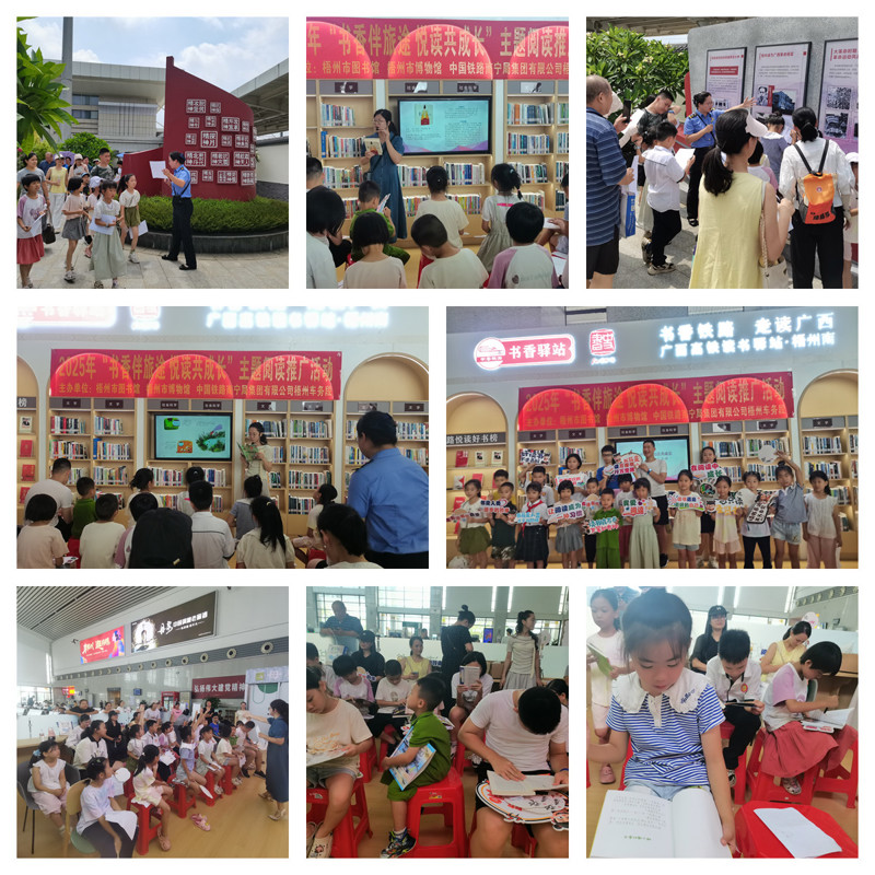 梧州市图书馆联合梧州市博物馆和梧州车务段,将红色教育、阅读推广与研学体验有机结合,受到旅客广泛欢迎。“红色研学·文化启航”环节,专业讲解员生动讲述铁路发展史中的红色故事,让家长和孩子在沉浸式聆听中接受文化熏陶。特别设计的亲子互动任务,家长和孩子手持任务卡共同探寻红色印记,在协作中传承红色基因。“书香驿站·阅读分享”精彩不断,图书馆工作人员现场朗诵经典读物片段,并为少儿读者推荐适读书目,互动问答更是让现场气氛热烈欢快。“文化体验·集章打卡”成为人气焦点,旅客们纷纷在主题背景前拍照,分享至社交平台,收获了印有特色印章的扇子,为旅途增添文化韵味。