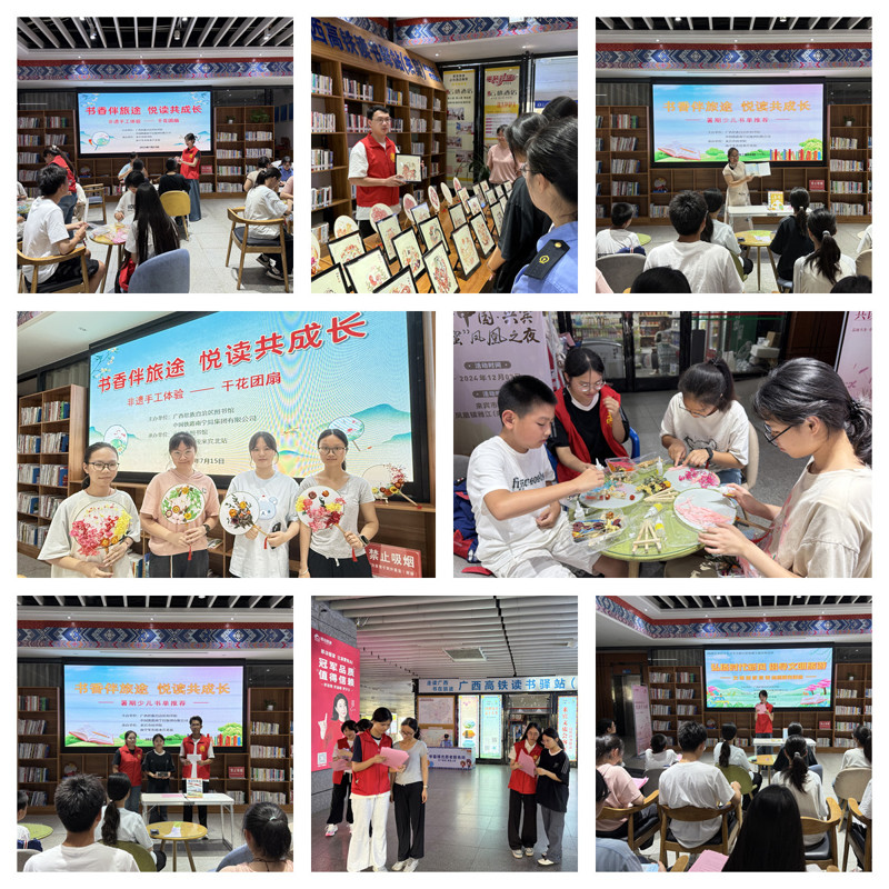 来宾市图书馆联合来宾北站推出系列精彩活动,为旅客的旅程增添难忘记忆。文化志愿者现场发放“暑期书单”,点燃了众多旅客的阅读热情。“非遗染色剪纸展”精彩亮相,一幅幅色彩绚丽、线条细腻的剪纸作品让旅客们流连忘返,零距离感受非遗文化的独特魅力。“干花团扇制作体验”氛围热烈,旅客们兴致勃勃地用干花创作个性团扇,在花香扇影中感受文化传承。此外,“文明旅游”宣传志愿服务同步开展,志愿者们向旅客积极倡导文明出行理念,让书香与文明相伴旅途。