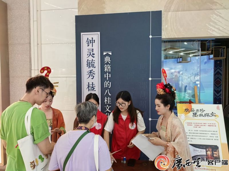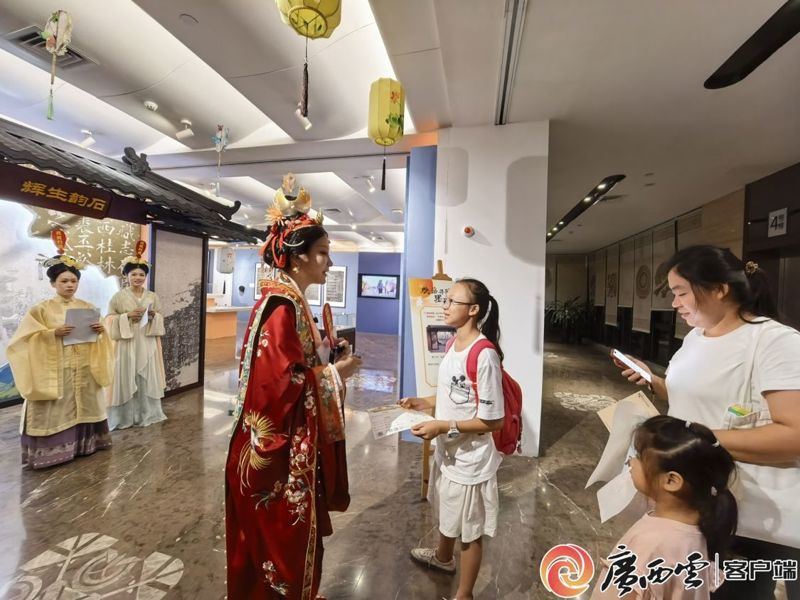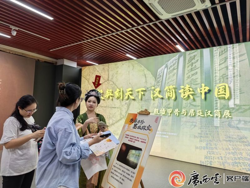 典籍寻珍,墨林探宝。在游园会展厅寻宝环节,广西图书馆主办的殷墟甲骨与居延汉简、典籍中的八桂文化展、广西人口较少民族拓片展3大常设展览巧妙串联,读者手持寻宝题卡,通过解锁识读甲骨文、寻找并背诵古诗词等任务,在破解文化密码的过程中,感受八桂千年文脉的深邃与厚重。