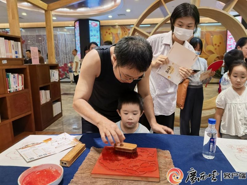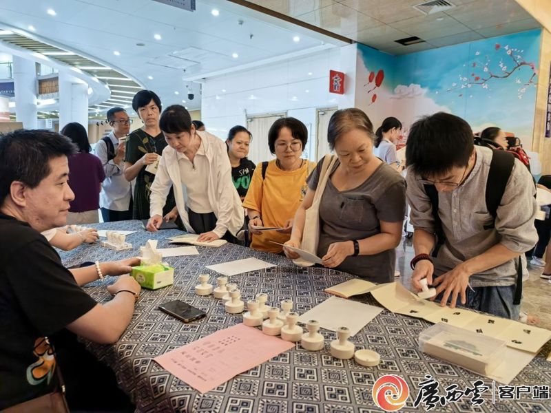 特色印章集章区同样人气高涨,广西图书馆原创的“吉祥话”“劝学诗”“百鸟衣”及“甲骨文十二生肖”系列印章首次集体亮相,以方寸之雅,为中秋游园留下一份独特的纪念。