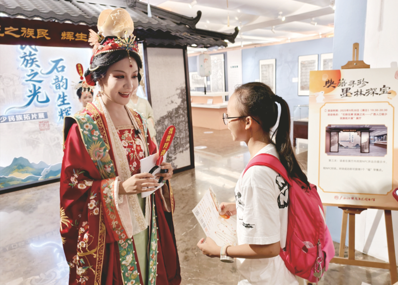 展厅内,读者手持题卡,兴致盎然地“穿行”于跨越千年的文明载体之间。从殷商的神秘甲骨、汉代的居延简牍,到承载八桂智慧的古典文献,再到记录民族记忆的金石拓片,大家通过识读甲骨文、寻找并背诵广西古诗词、与NPC对诗等任务,一步步解锁文明密码,在互动中亲近典籍、触摸历史。