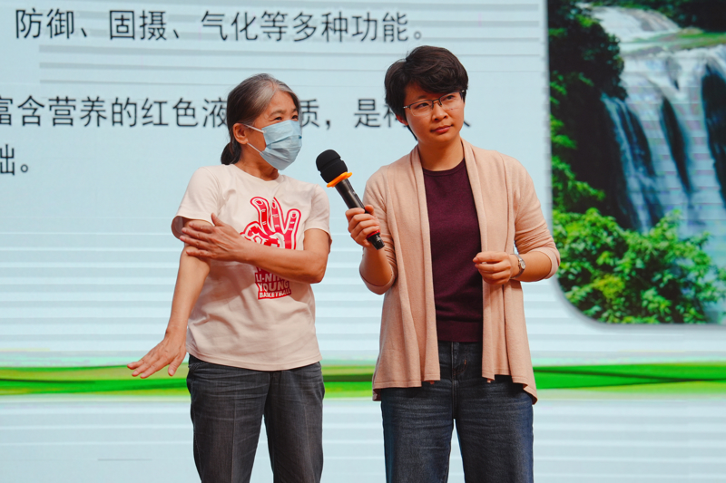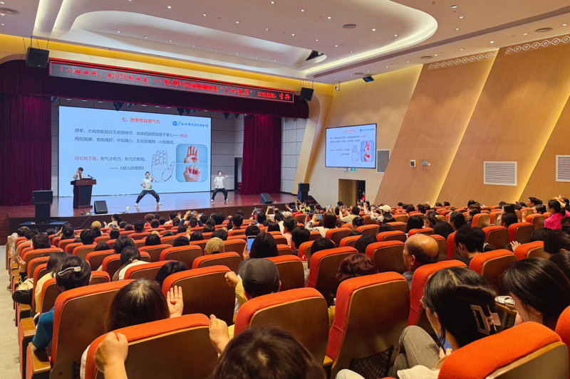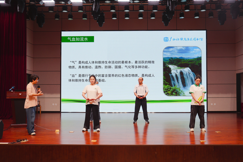 讲座不仅注重“知”,更强调“行”。李羚医师讲解了气血、经络的基本概念及其在人体中的运行规律,随后在助教同步示范下,细致拆解了八段锦从“双手托天理三焦”到“背后七颠百病消”的八个经典招式,讲解了动作标准、养生要点与常见难点。她特别强调了呼吸配合、意念专注与力度掌控等关键细节,让听众不仅“看到”,更“体会到”每一式背后的养生逻辑。