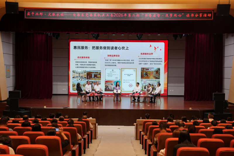 为深化党建引领、凝聚思想共识,推动理论学习与文化传承深度融合,扎实推进学习型党组织建设,3月31日下午,由自治区党委区直机关工委、中共广西壮族自治区图书馆委员会联合举办的“书香启智·逐梦同心”读书分享活动在广西图书馆举行。自治区党委区直机关工委副书记邹颖明、黄向明,自治区文化和旅游厅党组成员、副厅长,自治区文物局局长韦江,自治区党委区直机关工委二级巡视员邵国芳出席活动,自治区党委区直机关工委在职党支部党员,自治区文化和旅游厅机关党委党支部、公共服务处党支部党员及广西图书馆各党支部党员参加,在墨韵书香中交流心得、凝聚共识。