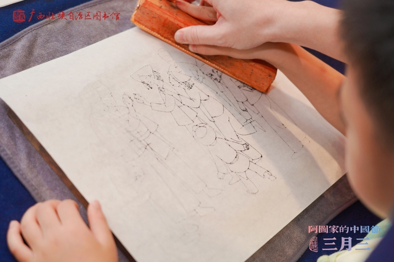 巧手指尖流转墨香,纸上绽放民俗之美。文化长廊处的“三月三民俗雕版印刷体验”活动区,读者们在老师的细致指导下,执刷、上墨、覆纸、轻拓,沉浸式感受雕版印刷的匠心与乐趣。结合此次活动特别推出的三月三限定民俗雕版,以“五色糯米饭”和“碰彩蛋”两大壮乡民俗为主题,画面中饱满生动的五色糯米饭和灵动可爱的碰彩蛋,承载着壮乡节日的美好寓意。读者们在一刷一拓间读懂非遗技艺,在一幅幅精美的作品中感受三月三的节日氛围。