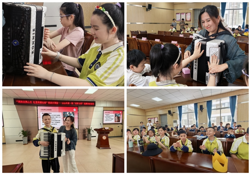 柳州市老年大学手风琴教师蒋雨晴现场助阵,倾情演奏了《花儿与少年》《杜鹃圆舞曲》《歌唱祖国》等经典曲目。演奏间隙,蒋老师热情邀请孩子们登台近距离感受手风琴的魅力。孩子们满怀好奇,在老师的悉心指导下,用指尖轻触琴键,感知风箱的开合,静静感受乐器的韵律,沉浸在音符编织的温暖氛围之中。