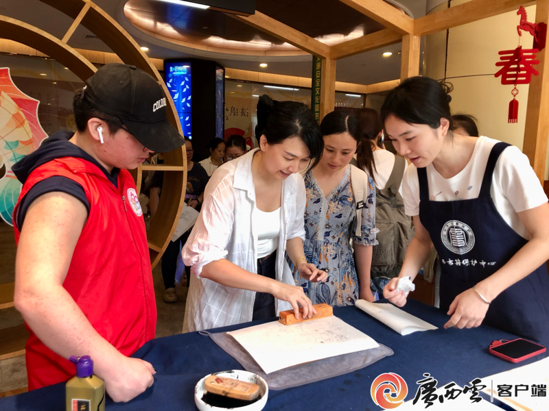 在该馆文化长廊的“三月三民俗雕版印刷”活动区,读者在老师们的细致指导下,执刷、上墨、覆纸、轻拓,沉浸式感受雕版印刷的匠心与乐趣。本次活动特别推出了三月三限定民俗雕版,以五色糯米饭和碰彩蛋两大壮族经典民俗为主题,承载着传统民族节日的美好寓意。