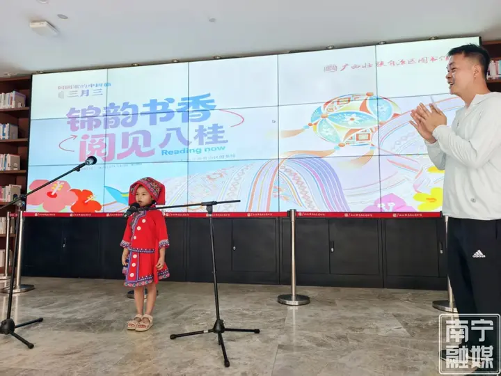 “三月三”怎能少得了山歌相伴?“什么结籽高又高咧?哎,高又高。”5岁的柠柠在爸爸妈妈的鼓励下,勇敢挑战“邀您一起唱山歌”活动,用稚嫩的嗓音唱起了幼儿园新教的经典山歌。当天的活动中,不少读者身着绚丽多彩的少数民族服饰,或独唱亮嗓,或结伴合唱,一段段质朴真挚的山歌,把平日里静谧雅致的图书馆变成了热闹欢腾的歌圩台。