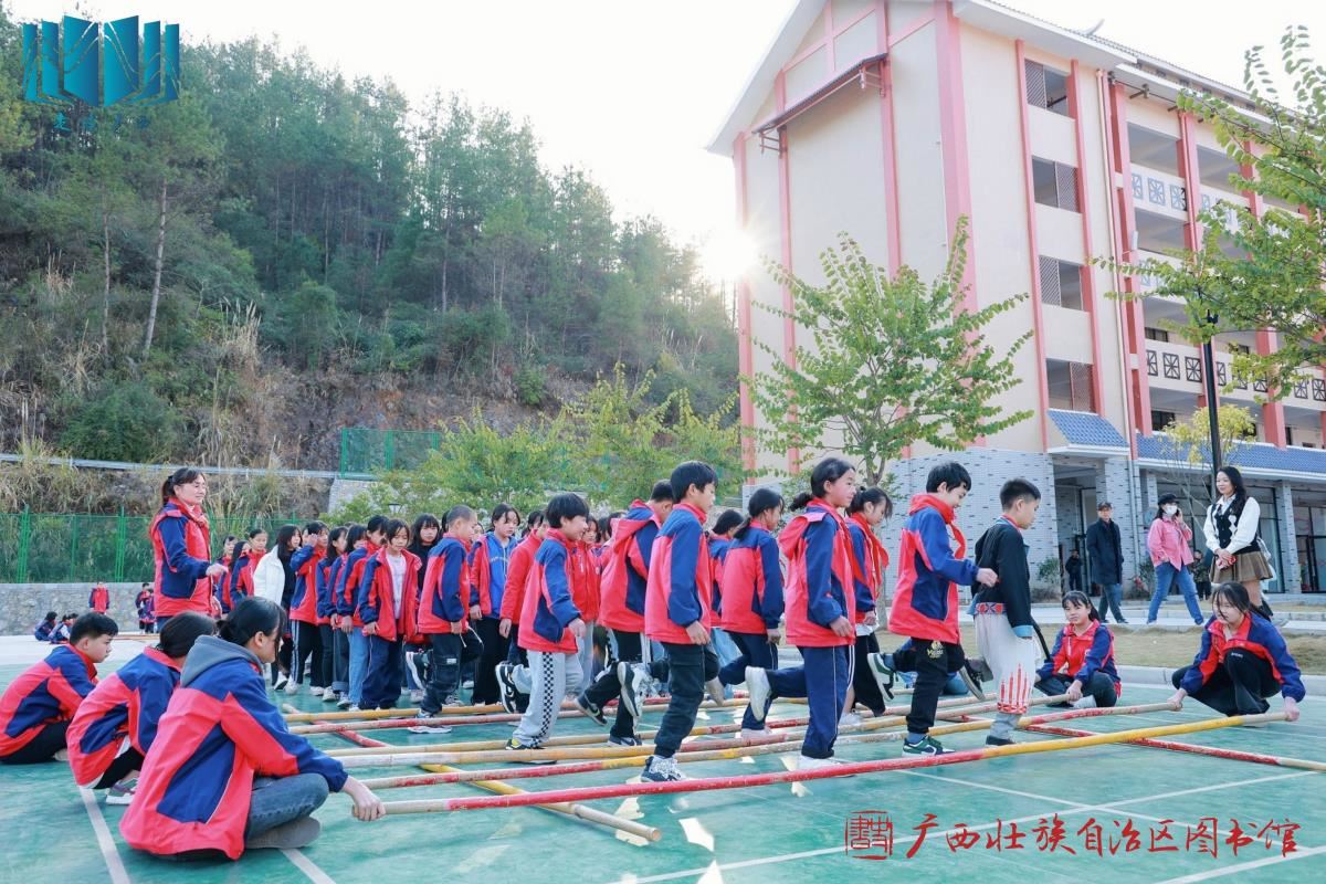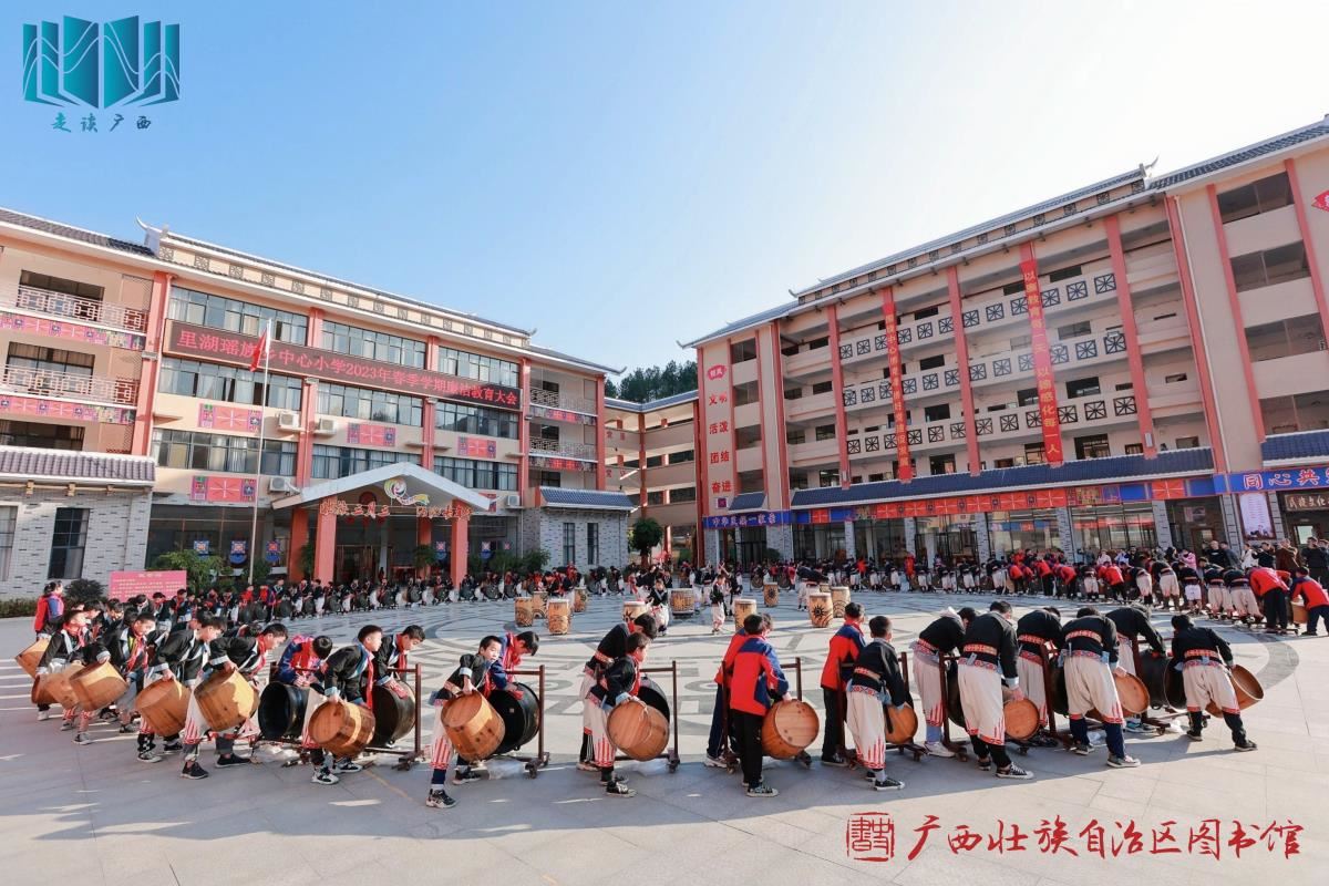 在王尚小学,走读团队听到了瑶语版的《我和我的祖国》,观看了铜鼓舞、打陀螺、传统瑶绣、吹牛角等白裤瑶传统文化气息浓厚的课间活动,惊叹于南丹白裤瑶文化的显示传承与活态应用。尤其是国家级非遗项目铜鼓舞《南丹勤泽格拉》,600多名小学生整齐起舞,铜鼓隆隆、鼓槌清脆,演绎出动人心魄的千年古韵,让所有人文化自信升腾而起,热血激昂。