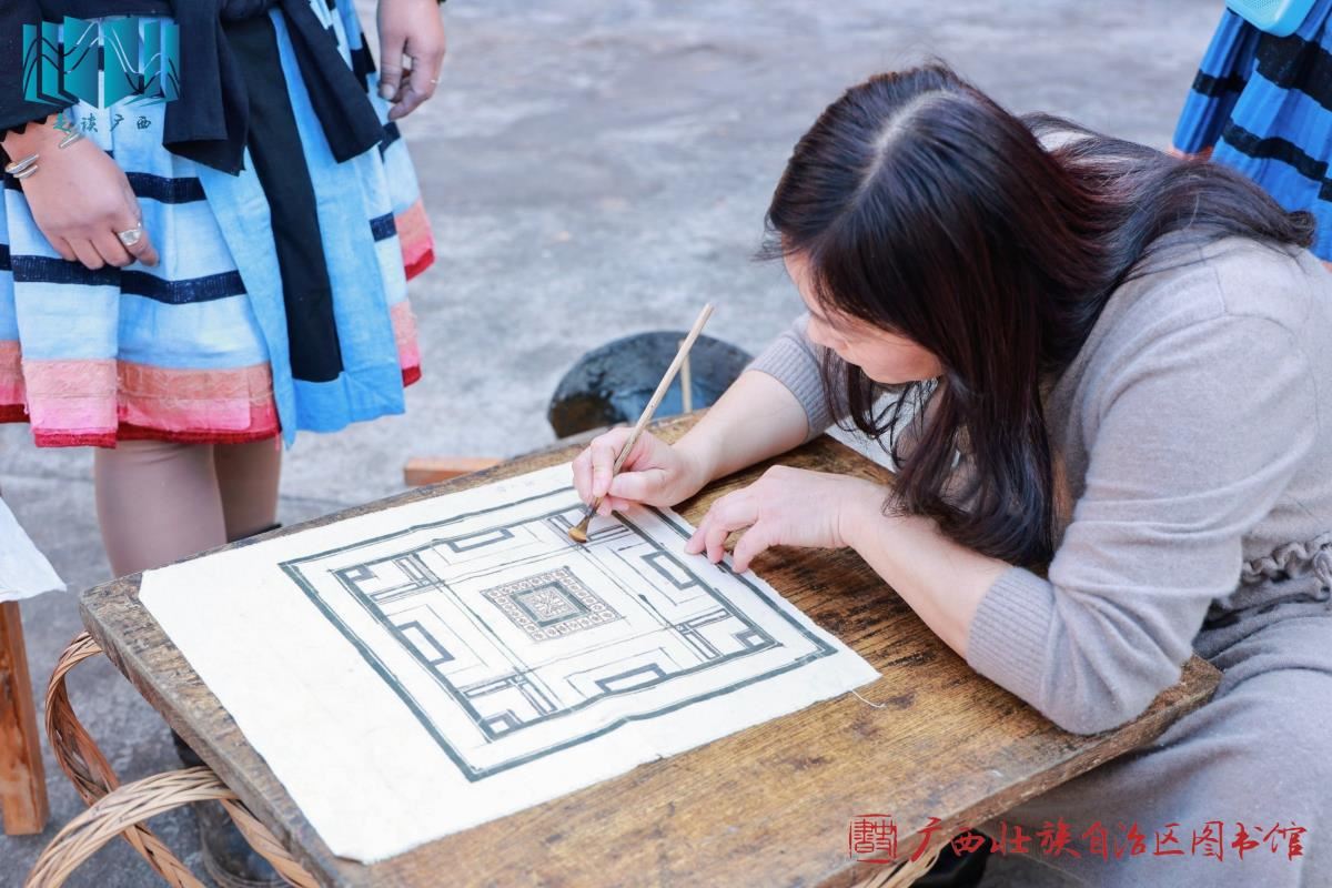 走读团队在里湖白裤瑶生态博物馆通过《南丹白裤瑶文化展》直观了解了白裤瑶的历史发展和生产、生活、娱乐、婚庆、服饰制作等文化,在国家级非遗传承人何金秀老师的带领下,体验了瑶族服饰制作中“跑纱”和“粘膏画”工序技艺:提着棉线锥架在有序树立的木桩中穿梭,棉线与手指摩擦的锋利感,手握蜡刀在棉布上勾勒瑶王印的线条,让所有人都觉得神奇又有趣,刚在展厅里看到的静态实物和图文瞬间鲜活起来。