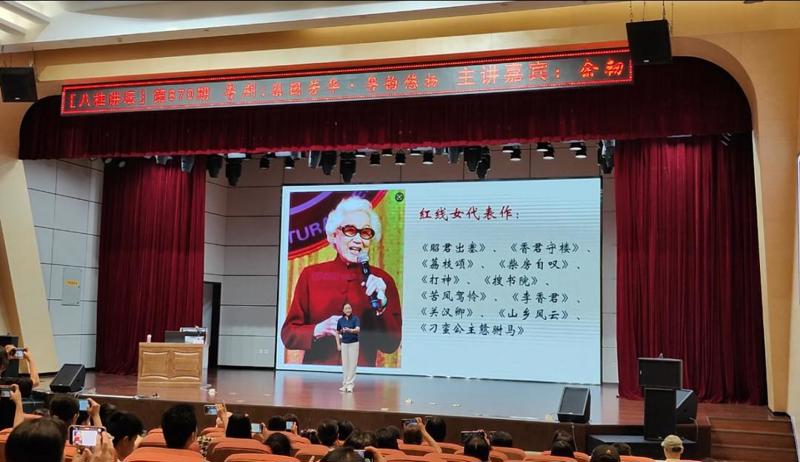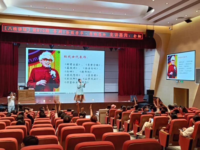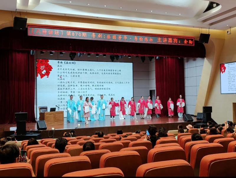 讲座中,余韧老师从粤剧的基础知识切入,详细介绍粤剧的百年发展脉络和南宁本土的戏曲发展史。讲到粤剧的行当和四功五法时,她即兴演绎了粤剧经典名曲《花田错会》,生动地展示了粤剧的唱腔转换,引得满堂喝彩。在介绍粤剧的经典曲目时,她还结合广西图书馆正在举办的“戴敦邦重温四大名著书画展”,向大家讲解粤剧对四大名著的经典演绎,并以《红楼梦》中《情僧偷到潇湘馆》桥段为引,详细阐释了粤剧如何通过手眼身法相互配合,精准传达出人物复杂的心境。今年恰逢粤剧艺术家红线女诞辰100周年,脍炙人口、享誉海内外的粤曲《荔枝颂》是其代表作之一,余韧老师以婉转悠扬的唱腔重现经典,让观众在熟悉的旋律中感受粤剧与时代共鸣的生命力。