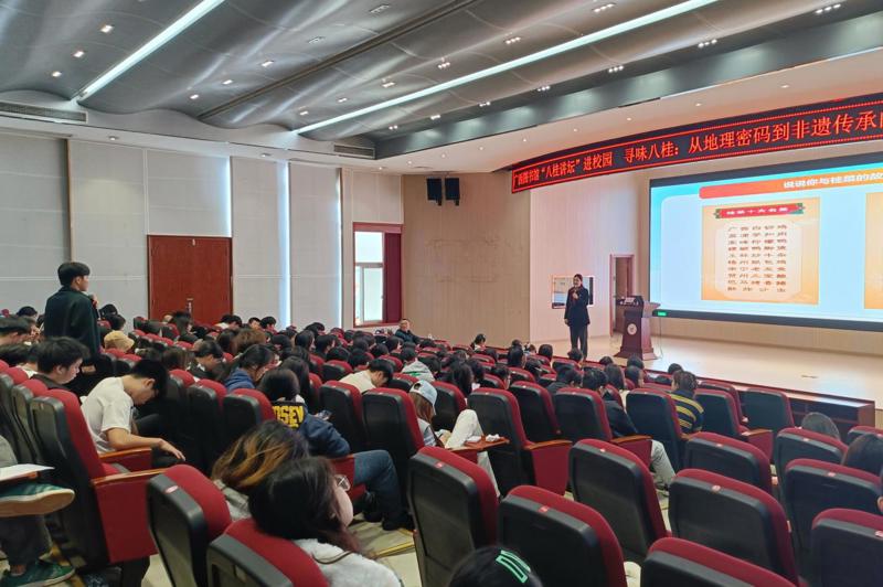 11月20日,广西图书馆“八桂讲坛”走进桂林理工大学南宁分校,举办“寻味八桂——从地理密码到非遗传承的舌尖之旅”专题讲座。讲座特邀广西职业技术学院副教授、博士林叶新担任主讲,以一段充满烟火气的广西美食宣传视频开场,通过生动讲解与图片展示,带领现场300余名师生开启了一场舌尖上的文化探索之旅。