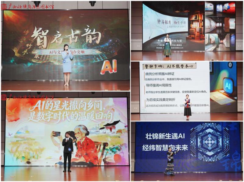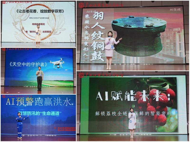 决赛现场,选手们的演讲紧扣主题、内容充实、视角多元,紧密结合广西本土特色与发展实际,生动呈现了人工智能技术赋能千行百业的广阔前景与深刻思考,展现出当代大学生立足本土、面向未来的思考深度与使命担当。有选手聚焦民生福祉,关注“一老一小”与公共安全,通过“AI赋能教育”“给长辈的数字手杖”“AI预警,跑赢洪水”等视角,彰显了科技的温度。有选手深入田间地头,关注科技赋能乡村振兴,以“百色芒果园的智慧蜕变”“一根甘蔗的故事”“解锁荔枝全链路保鲜的智能密码”等为例,描绘了智慧农业的新图景。有选手巧妙结合地方文旅资源与非遗传承,将视野投向文化传承与创新领域,通过“从一碗螺蛳粉到一座智慧城”“壮锦新生遇AI”“智能药香里的传承课”等选题,揭示了人工智能技术激活传统文化基因、重构文化表达方式的可能。