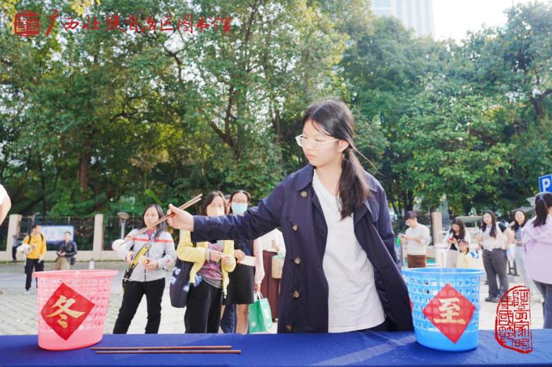 在湖边广场的活动区,读者们或亲子协作,挑战冬至民俗与白头叶猴主题拼图;或组队竞技,将毽子精准踢入印有“冬”“至”字样的背篓;或手持筷子,小心翼翼地夹起象征团圆的乒乓球“汤圆”;或围站在雕版印刷台前,亲手拓印出带着锦鲤福娃的“好运连连”年画,将冬日喜气收入囊中。每完成一项挑战,便能收获一枚寓意吉祥的文创印章,在欢乐的体验中了解冬至饮食、娱乐、养生的传统习俗,深切体会“冬至大如年”的文化底蕴与礼仪内涵。