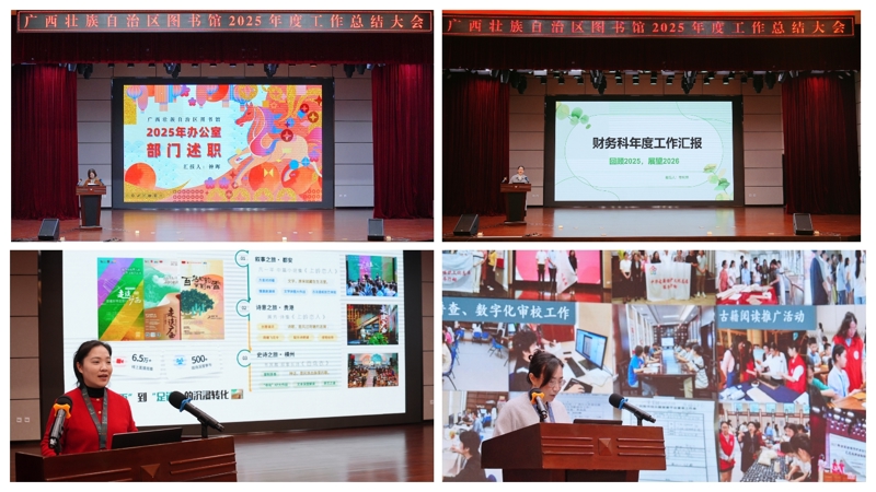 2026年1月26日,广西壮族自治区图书馆2025年度工作总结大会顺利召开。会议全面回顾2025年各项工作的扎实成效,系统部署2026年重点工作任务。广西壮族自治区图书馆馆长秦小燕,党委书记罗宇,党委副书记、纪委书记彭松林,副馆长曾红辉、梁晓岚出席会议,副馆长甘新主持会议。
