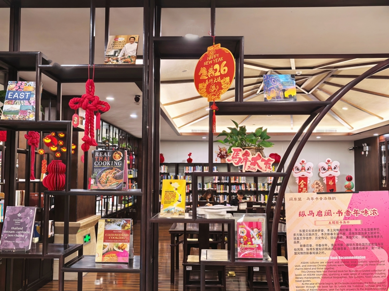 2月7日,“纵马启阅·书香年味浓”主题书展启幕。读者步入东盟文献阅览室与外文文献借阅室,大红灯笼、中国结、马年创意摆件等雅致装饰,与满架图书共同营造出一个书香馥郁、年味醇厚的阅读空间。读者漫步书展,可以从越南的节日民俗里感受异域年味,从马来西亚的多元文化中领略交融之美,从新加坡的华人过年美食中找寻同根温情。线上同步推出的“Chinese New Year:Traditions and Rituals”和“东盟语种讲中国春节”外文主题书刊推荐,以多语种文献的阅读延伸开启新岁,与广大读者共同奔赴一场独具东盟风情的新春阅读之约。