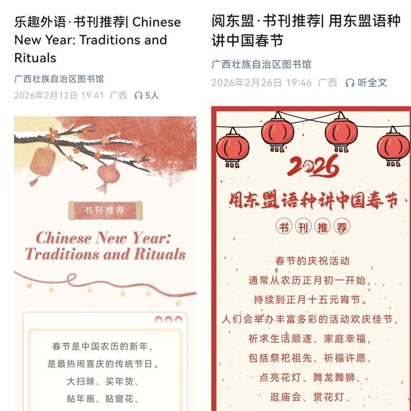 “阅东盟·马年书香添雅韵”系列阅读推广活动,是广西图书馆结合馆藏特色资源优势,贯彻落实《全民阅读促进条例》的一次创新实践。活动依托“阅东盟”品牌,首次将中国春节与东盟文献巧妙结合,以知识性与趣味性为策划主线,通过外语祝福、手工体验、线上答题、知识互动等丰富形式,将东盟文献资源转化为可感知、可参与、可互动的文化体验,让“过年”不仅有阖家团圆的烟火气,更有跨越国界的书香味。