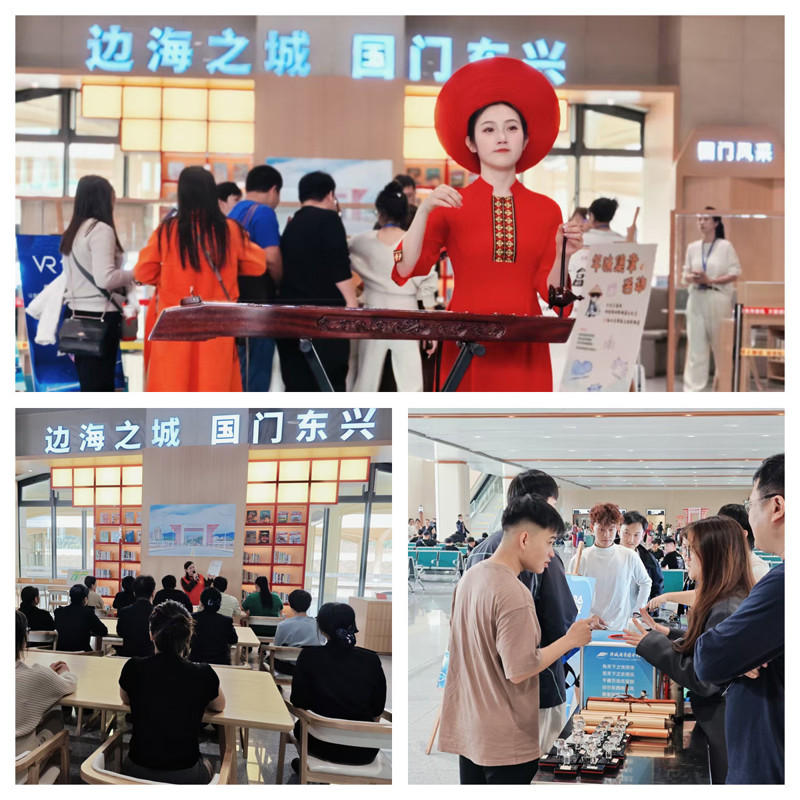 活动现场,各类特色活动精彩上演,将阅读服务和边境文化展示深度融合,带领旅客沉浸式感受国门文化韵味。活动邀请了独弦琴非遗传承人演奏边境特色曲目,讲解独弦琴的历史渊源与传统制作工艺,展现独弦琴的魅力;图书馆员结合东兴万尾金滩、东兴口岸、大清国钦州界五号界碑等旅游打卡点开展图书推荐,解读地方人文历史与自然风貌景观,让旅客在候车间隙领略边境风情。此外,现场设置特色盖章打卡环节,精选16枚防城港地标图案印章,新颖的互动形式吸引了众多旅客踊跃参与,为旅途留下独特的边境文化印记。