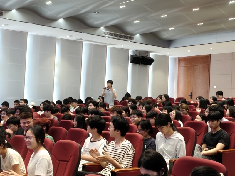 讲座在广西少数民族语言山歌翻译与传播的探讨环节达到高潮。覃老师用汉语深入讲解,以壮语吟唱经典山歌片段,甚至用英语进行别样演绎,生动展现了广西山歌跨越语言障碍、走向世界的潜力与魅力。此外,讲座中还穿插了多段原汁原味的山歌表演,并现场教唱电影《刘三姐》中的经典片段,现场师生们亲身体验了“以歌代言”的乐趣,学唱声、欢笑声此起彼伏,气氛热烈。一位来自外省的同学激动地表示,这是自己第一次近距离、沉浸式感受广西山歌,“完全大开眼界,颠覆了想象”。