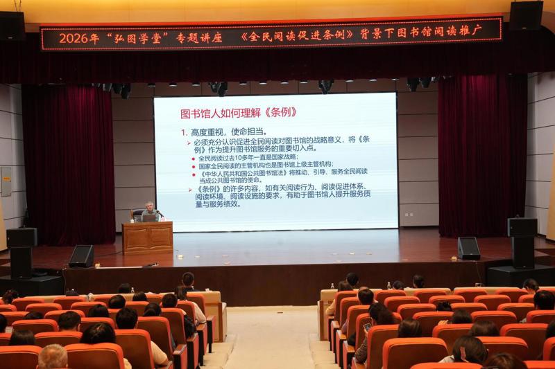 4月7日下午,广西图书馆举办2026年度“弘图学堂”专题讲座。讲座以“《全民阅读促进条例》背景下的图书馆阅读推广”为主题,特邀中国图书馆学会阅读推广委员会顾问、华东师范大学范并思教授主讲。130余名馆员参加讲座。
